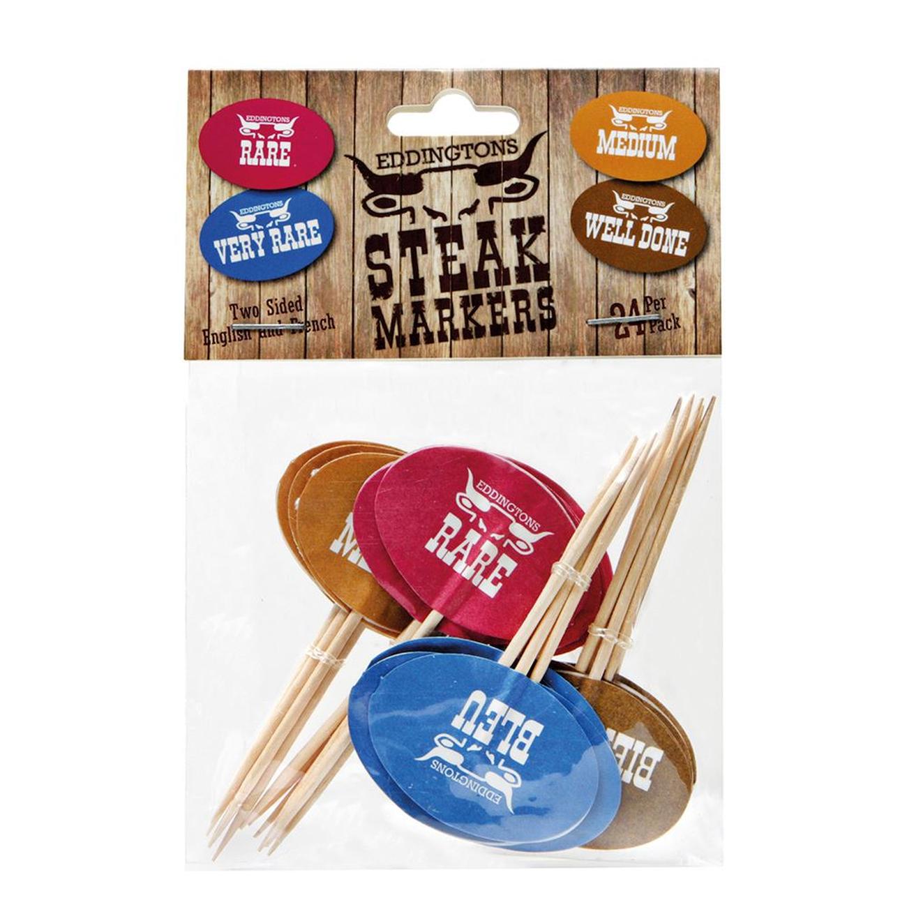 Identify steaks at a glance with this pack of 24 steak markers. Double-sided English and French, place a marker in each steak to ensure there is no confusion over whose steak is who’s at the dining table! Dipose after one use.