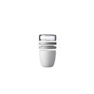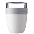Lunch pot Ellipse in white. This white Ellipse lunch pot from Mepal is one handy product which can be used to carry a snack or lunch, but is divided up into two compartments so that the different ingredients can stay separated. For example yoghurt and muesli or fruit can be placed in a separate container, but the lid of the yoghurt container is not the bottom of the muesli container. The two compartments can be separated with a simple twist, so that the ingredients can be mixed together. A clever solution for avoiding a mess when mixing the different ingredients. It has never been this easy! Both containers have separate lids which will keep them nice and clean. Another smart feature is that the lids fit on both containers, so you never have to search for the right lid in the morning. The capacity of the transparent top container is 200 ml, which means that it can fit about 75 grams of muesli. The capacity of the bottom container is 500 ml, enough to fit a large portion of soup, noodles or yoghurt. The lunch pot is made of durable material and can be used in the freezer, the microwave (with the lid removed) and the dishwasher. The top transparent container cannot be used in the microwave.