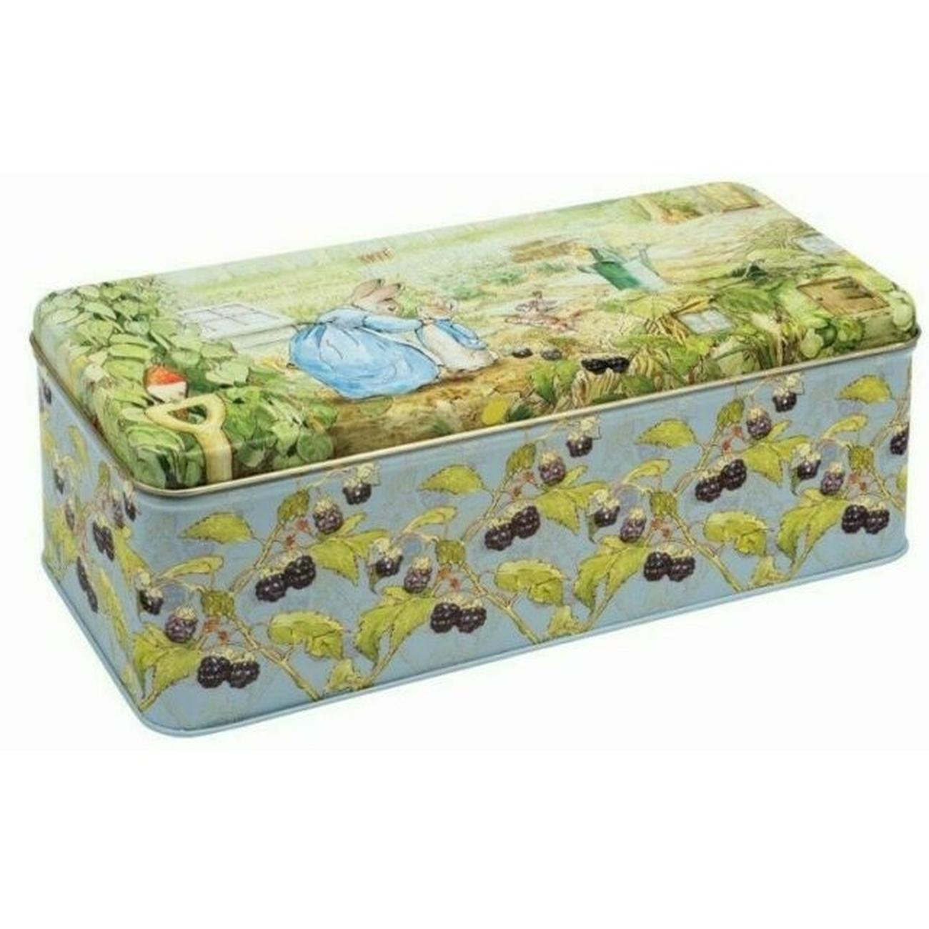 Peter Rabbit, an all-time favourite classic character by Beatrix Potter, is featured on this illustrated tin with a flip lid, together with Mrs Rabbit. A lovely giftbox for gifting biscuits and cookies, or for someone who is a Peter Rabbit fan!