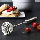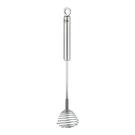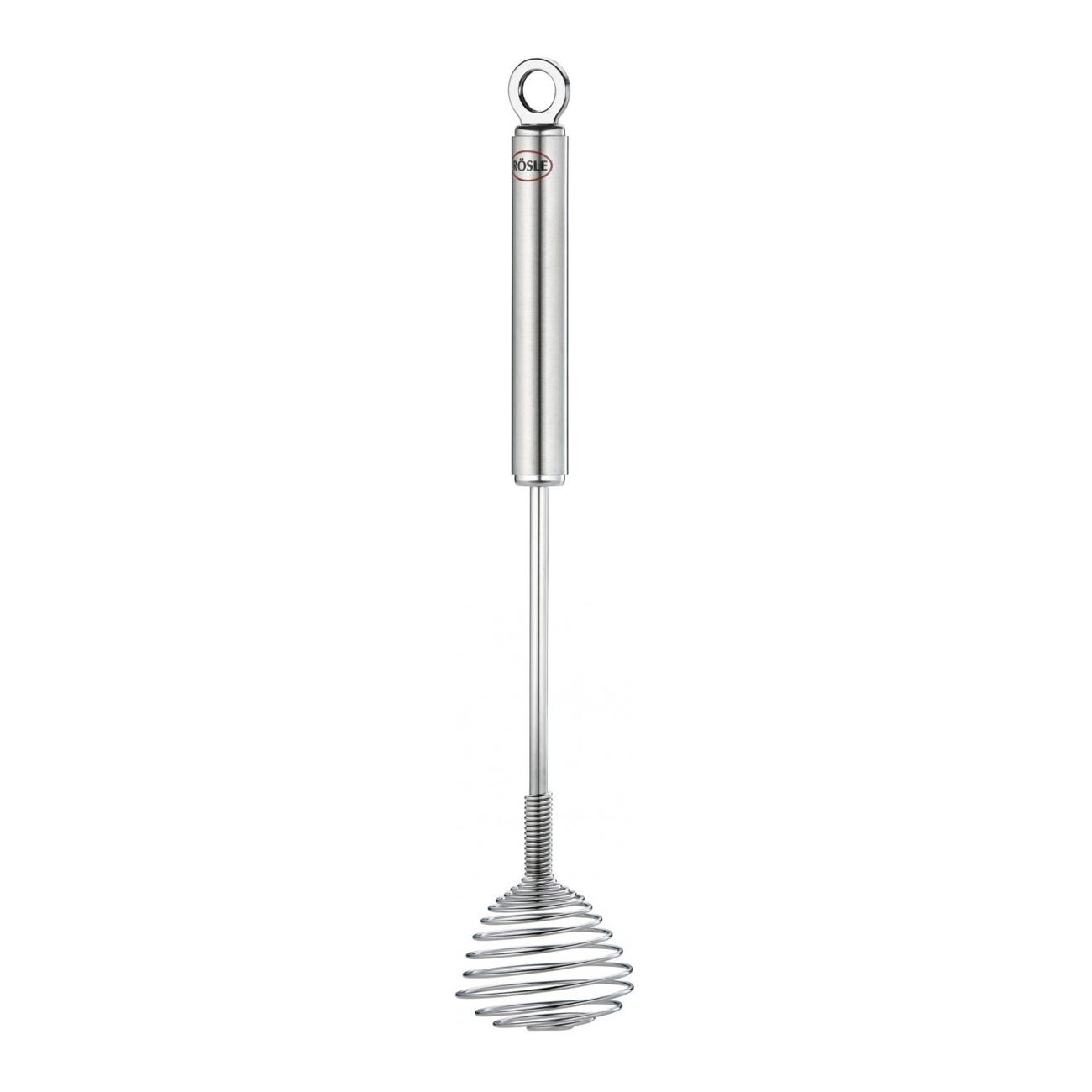 The flexible spiral shape of the Rösle Twirl Whisk facilitates airy beating of mixes reaching the base and all corners of mixing bowls and narrow containers and preventing unevenness in the mix. Perfect for beating small quantities of custard or gelatin, the whisk is perfectly balanced for ease of use. Constructed of durable, non-corrosive 18/10 stainless steel, whisk has a handy loop on the handle for convenient hanging.