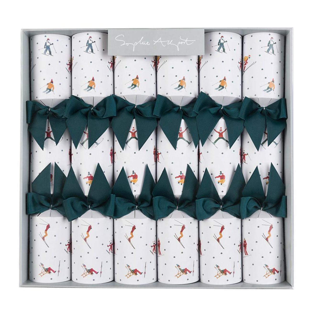 These white Skiing Christmas crackers finished with navy ribbon will bring smiles and laughter to your dinner table - each cracker contains a paper hat, fun joke and toy.